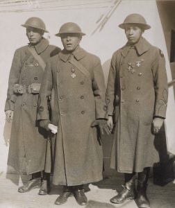 He got called up again in 1918 in World War I, when the National Guard regiment was assigned to the 93rd Division. When they got to Europe, the African-American Division was assigned to the command of the French, mostly because the Army didn’t want to deal with the issues of segregation. The 93rd fought under Marshall Foch at the Meuse-Argonne Offensive and the Oise-Aisne Offensive. Over 500 soldiers in the 93rd receive the French Croix de Guerre for gallantry in the face of the enemy, 520 were killed, and 2,600 were wounded. The U.S. Army ignored the 93rd because officially it had zero days in battle because it hadn’t fought with the U.S. Army. Under pressure, the U.S. Government acknowledged in 1919 that the unit had seen combat and awarded 75 Distinguished Service Crosses.