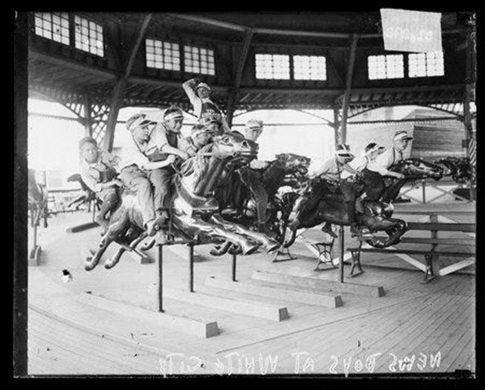 Most rides were separate concessions with a separate fee. The newsboys that sold the Daily News had a day at the park in 1928. Some of the photos are stiff and posed but they had a good time posing for this one on the carousel. [Chicago History Museum]