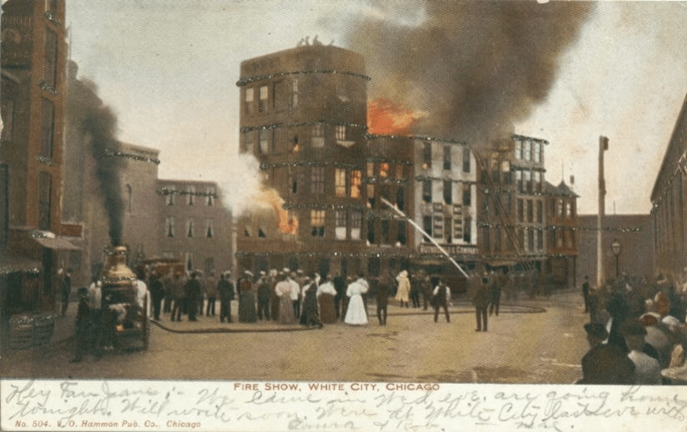The Fire Show was a “mammoth spectacle of burning buildings.” It had a grandstand that seated 1500, who watched an urban scene complete with a passing streetcar and delivery wagons and 250 actors and technicians. Actors put on a street scene until someone shouted “Fire.” Buildings were “set aflame,” and screaming actors jumped from windows to life nets below as firemen doused the burning buildings. This concession was a bad omen–the amusement park had fires in 1911, 1925, and 1927. The 1927 fire destroyed the iconic tower and most of the park. The concessions didn’t survive for long afterwards. Photo Credit: chuckmanchicagonostalgia.files.wordpress.com
