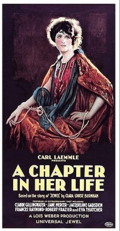 She was rejected at first but in the end published 26 novels, sold half a million copies, and had a national audience. Several of Burnham’s books were made into plays and movies. The movie version of Jewel came out in 1915 and was remade in 1923 as A Chapter of Her Life–directed by a woman, Lois Weber. Clara’s name appeared above the stars on the poster, so her fame lasted in her lifetime.