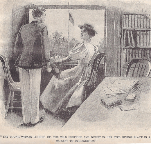 I haven’t read Apple Blossom Time, but most of what I’ve read is more like this illustration of a young woman at a window looking up at a young man in mild surprise.